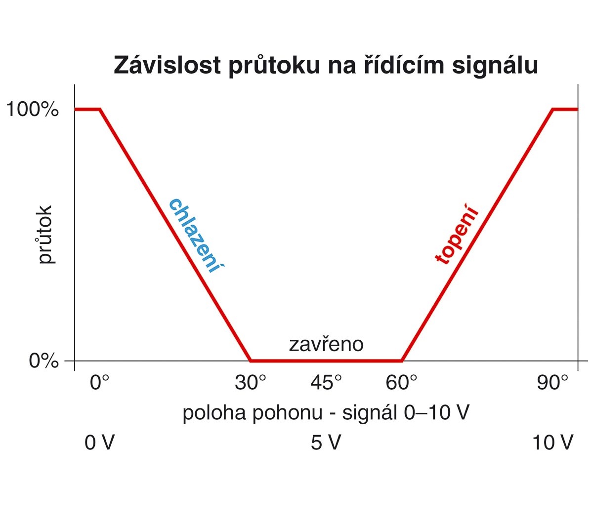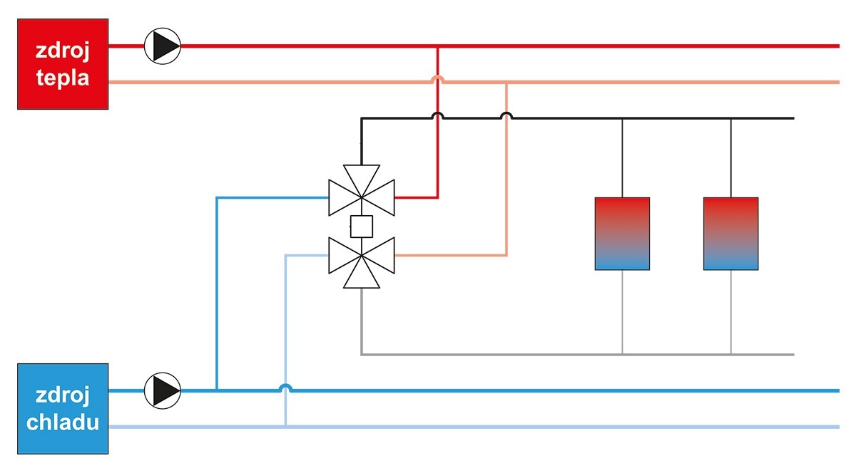 Kulový kohout s ovládacím pohonem se spojitým řízením 0–10 V slouží jak pro přepínání režimu topení / chlazení, tak pro spojitou regulaci výkonu připojeného spotřebiče.